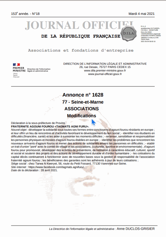 L'association ayant pour titre : FRATERNITE AGOUNI FOUROU est créée sous le numéro W773006364. Son annonce coïncidant avec le double anniversaire du printemps noir d’avril 2001 et Amazigh d’avril 1980.